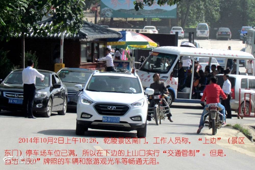 网友自述,当天九时半许,他驱车来到乾陵南门景区门口。由于车上有几位老人,加上同行的一辆车已经开到东门车场,车上还有几个证件,遂决定向西绕行环山旅游路到东门汇合。左转准备上山,工作人员过来说买了票才能上去。尽管这里没有检票口,也明明知道开到东门停车场仍然可以买门票,但还是服从安排买了票。买票用了不到两分钟,正准备发车上山,就见工作人员拉出一个写有“管制”两个大字的栅栏说,上面车位满了,车辆不能上去。即使一再说明情况,工作人员态度恶劣,还以拖车进行威胁。