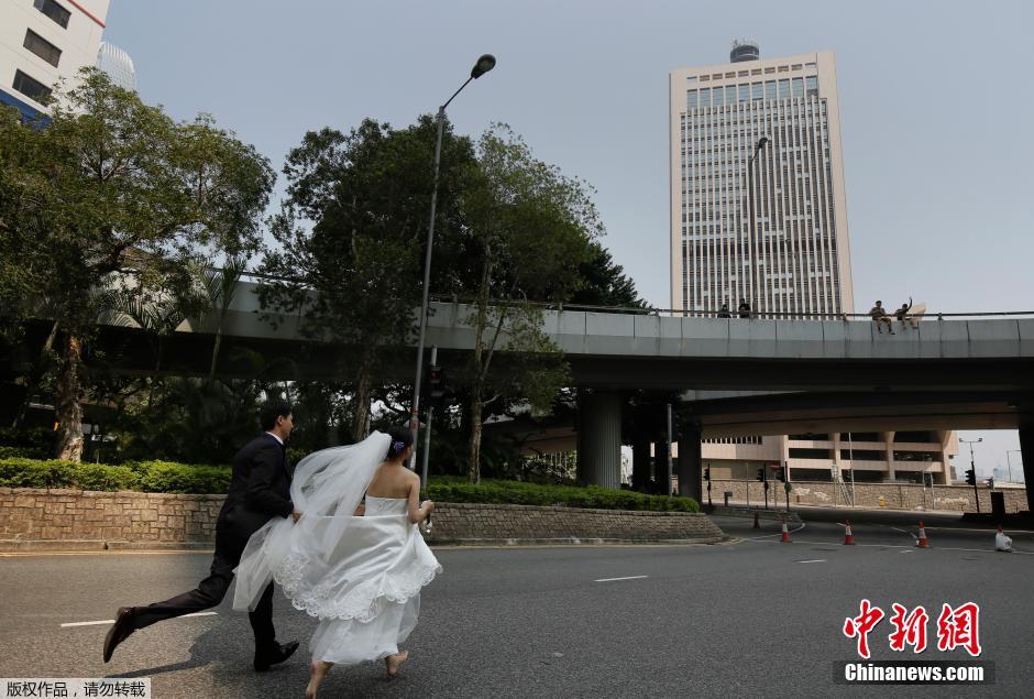 10月15日消息,据香港《大公报》报道,“占中”人士霸占金钟超过两星期,14日警方清理金钟道路障期间,一对新人不顾沿途大批警员及示威者的目光,在马路上拔足狂奔,由金钟红棉道封路区,横跨金钟道及夏悫道飞奔,往中环大会堂婚姻注册处,只为不错过婚姻注册佳期。
