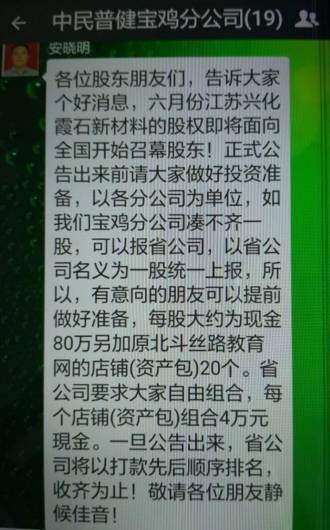 据芳芳反映,中民普健宝鸡分公司发起人为宝鸡市质监局高新分局原副局长安晓明的儿子,安晓明本人也参与该公司经营,该公司有一个名为“中民普健宝鸡分公司”的微信群。芳芳提供的证据显示,安晓明就是该群的管理人员,经常在群里发布一些告知股东的通知或信息。6月13日,记者前往宝鸡市质监局高新分局对此采访求证,安晓明请假不在单位,采访未果。