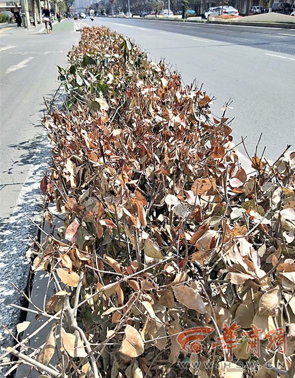 “绿化带里的绿植都枯死了!”3月14日,市民王先生向华商报反映,称自己经常乘坐公交车路过科技路,发现沿线不少绿化隔离带内的绿植都有干枯的情况,“尤其是徐家庄公交站附近,那一排绿植基本都枯死了。”
