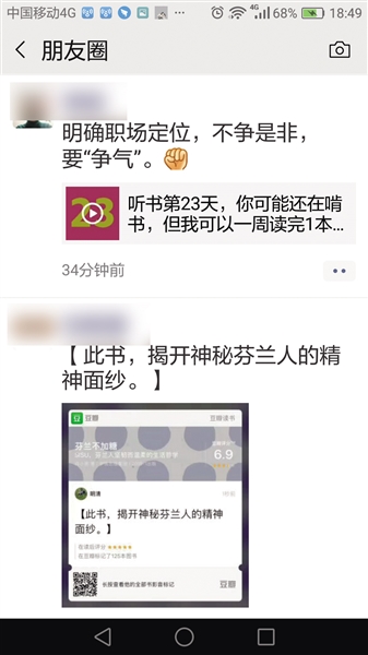 西北农林大学的庞潇同学在水滴阅读上已经坚持了82天,昨日,她告诉记者,“还有不到20天就结束,已经养成习惯了”。时下流行的这类朋友圈打卡计划因为积极向上的学习光环,暗合了人们使用朋友圈的展示心理:一些加入这类分享朋友圈打卡计划的读者表示:“希望身边人可以知道我在学习,他们的关注会让自己更加自律,养成学习习惯,更容易打完卡。”