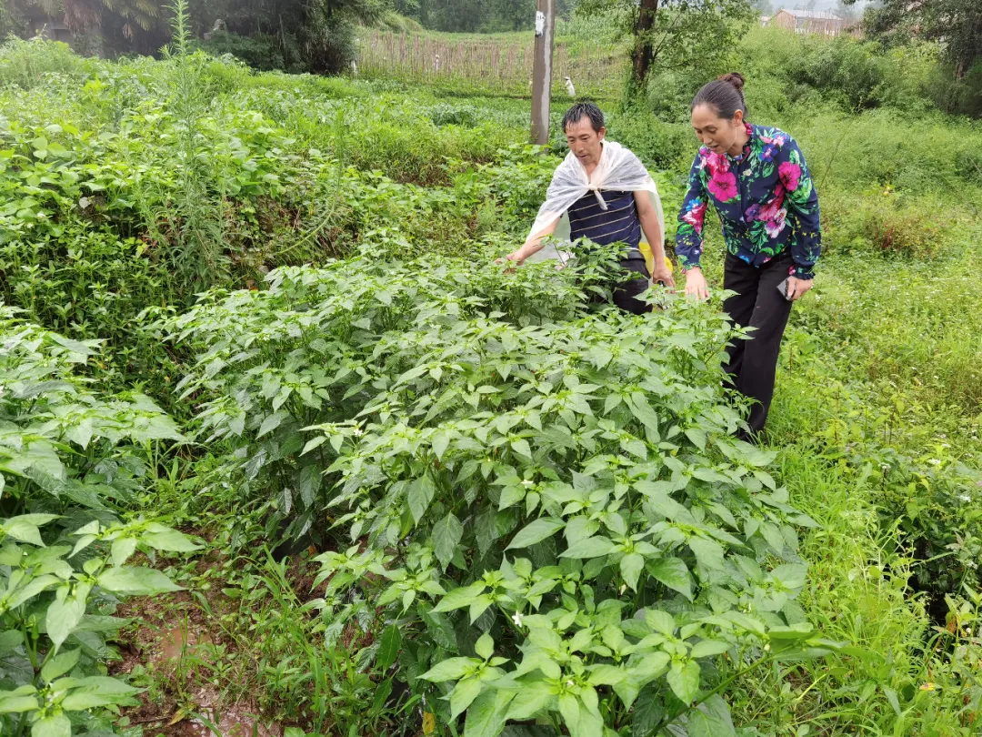 平日里,谭建兰(右一)常到辣椒种植户走访,了解生产情况。摄影/张双山