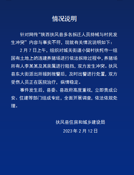 针对网传“陕西扶风县多名拆迁人员持械与村民发生冲突”内容与事实不符,现就有关情况说明如下: