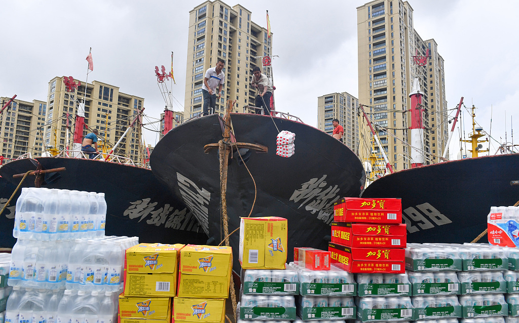 2023年7月30日,浙江省舟山市岱山县高亭中心渔港,渔民们正在将生活物资搬运到船上。