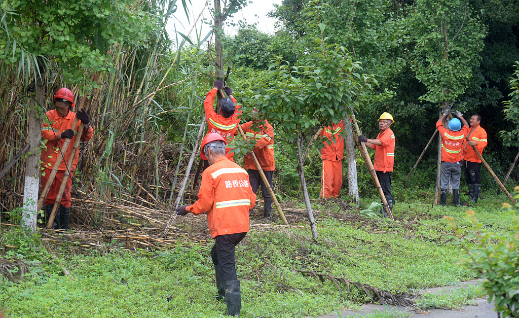 2023年7月30日,浙江台州,台风“卡努”逼近,绿化养护工人为树木强基加固。