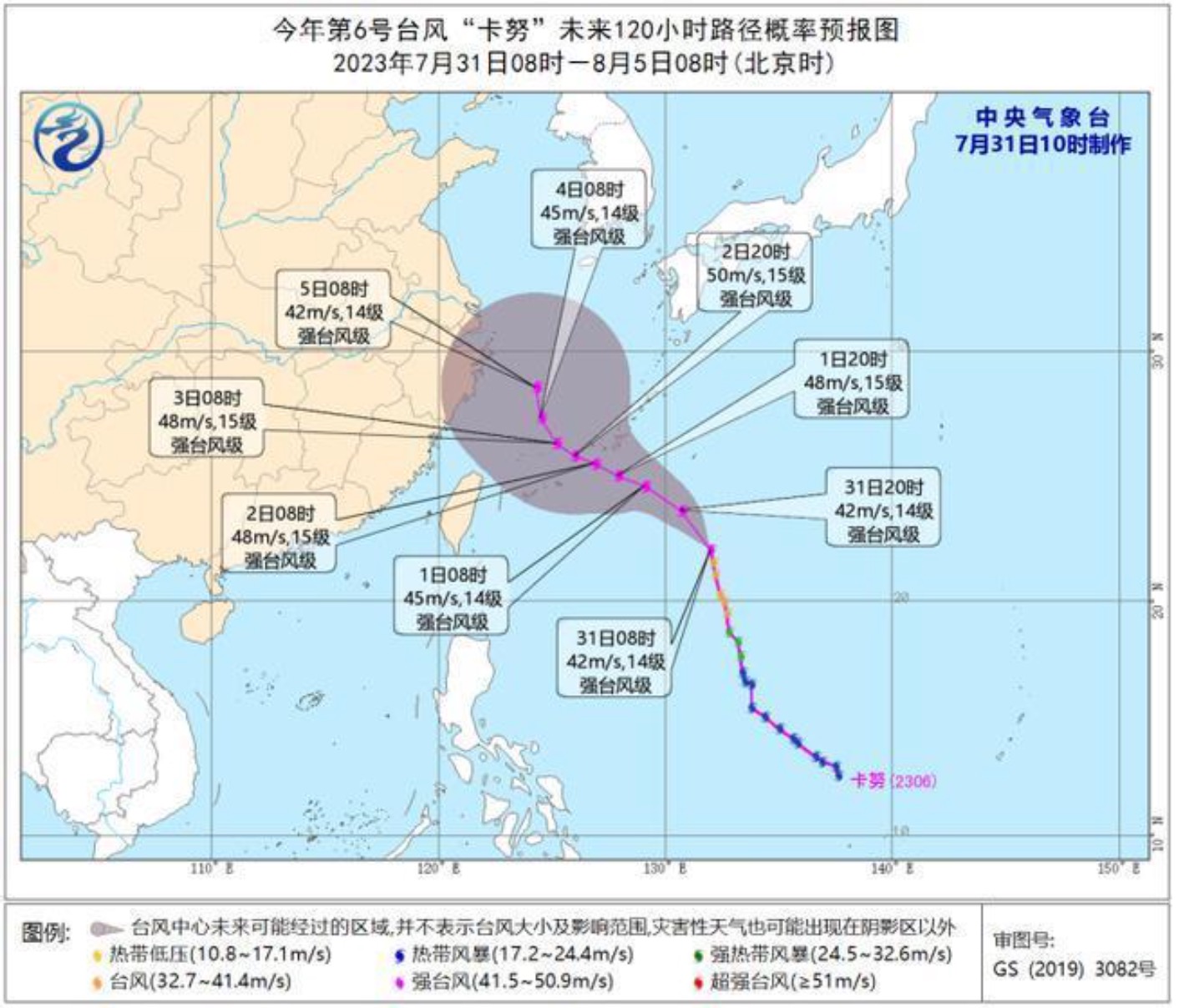中央气象台7月31日10时继续发布台风预报:今年第6号台风“卡努”(KHANUN)已于今天(7月31日)上午由台风级加强为强台风级,8点钟其中心位于琉球群岛那霸市东南方向约630公里的西北太平洋洋面上,中心附近最大风力有14级(42米/秒)。预计7月31日转向西北方向移动,强度逐渐增强,最强可达强台风级或超强台风级,8月1日白天移入东海,并逐渐向我国华东沿海靠近。浙江省防指于7月30日18时将海上防台风应急响应调整为防台风Ⅳ级应急响应。