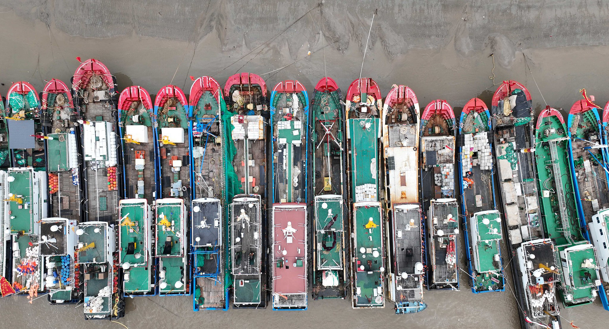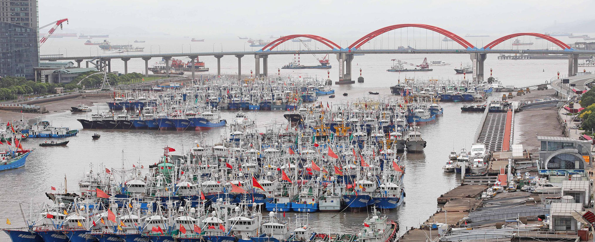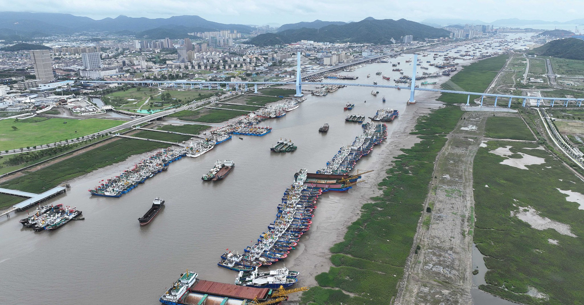 2023年7月30日,浙江舟山,台风“卡努”逼近,大量渔船陆续停靠在港。
