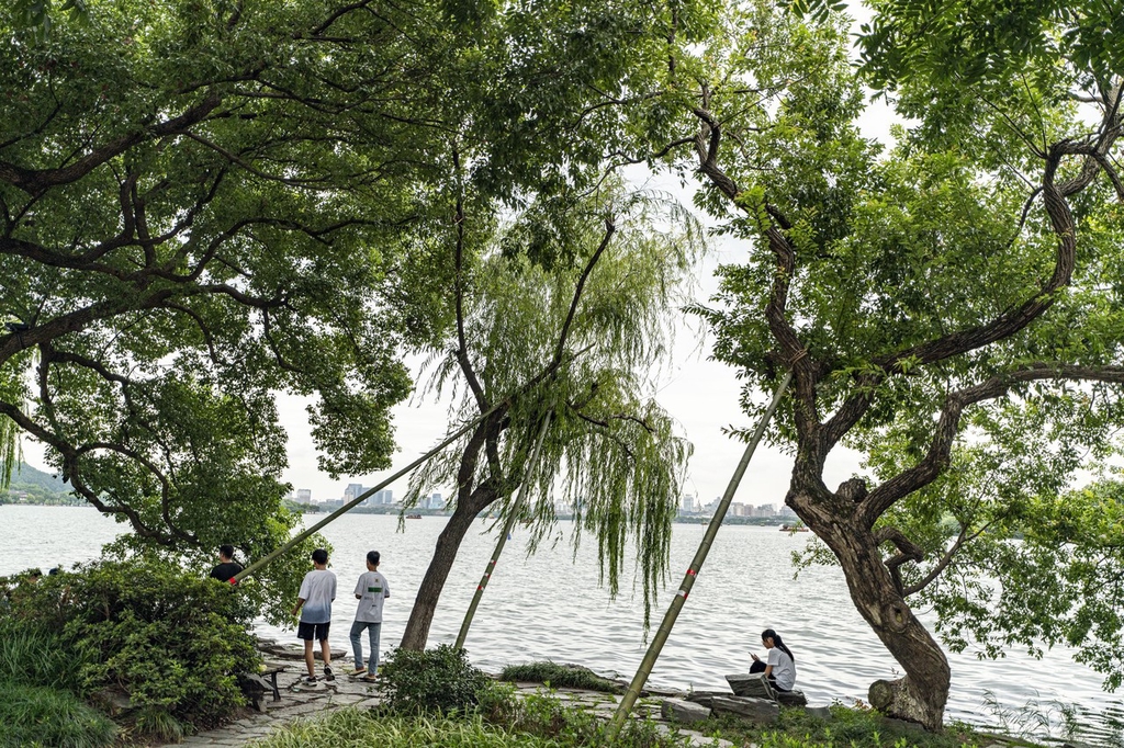 2023年7月30日,浙江杭州,为预防台风“卡努”到来,相关部门人员对西湖边树木进行了加固。