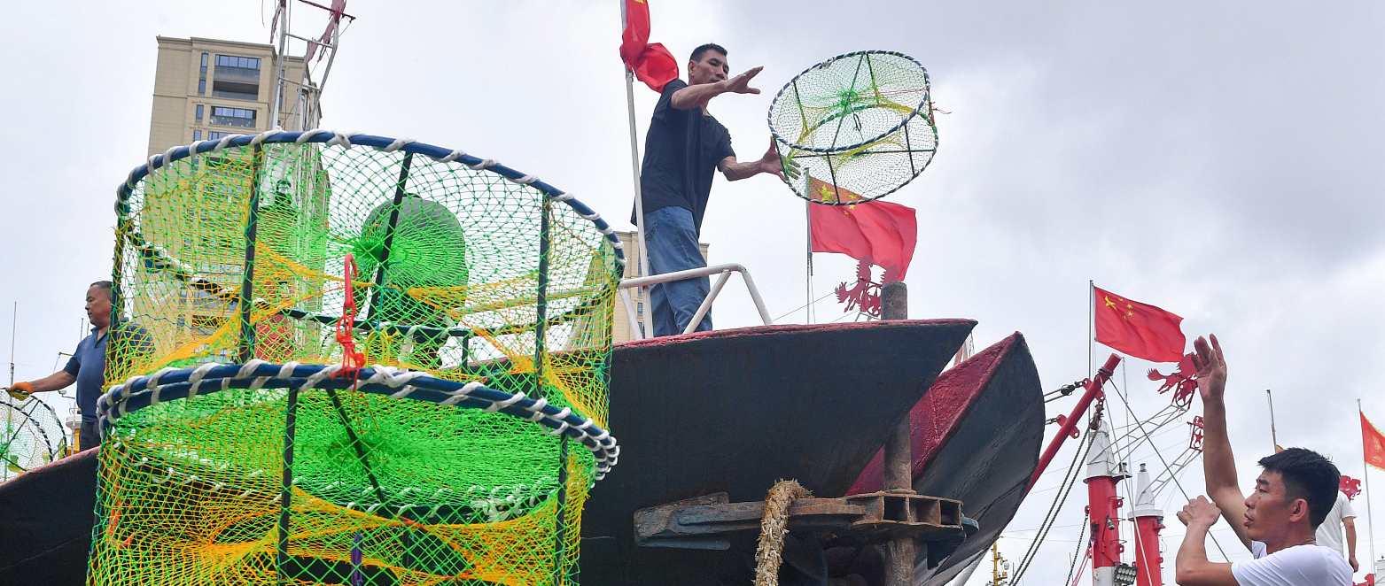 2023年7月30日,浙江省舟山市岱山县高亭中心渔港,渔民们正在将蟹笼搬运到船上。