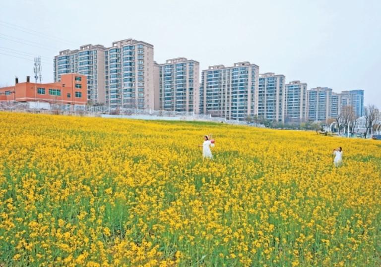 3月25日,西安长安中央公园大片油菜花进入盛花期,金黄的油菜花随风起伏,蜜蜂穿梭其间,生机盎然。图为市民游客在花海打卡拍照。