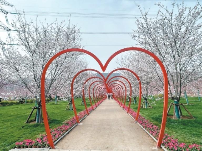 据了解,樱花园经过精心规划布局,花卉品种丰富多样,涵盖春寒樱、寒绯樱、垂枝樱、郁金樱等多个优质樱花品种,花色从绯红、粉白到浅黄依次绽放,花形或舒展奔放或轻柔垂坠,各具风韵。园内还搭配栽植海棠系列及北京丁香、中华木绣球、欧洲木绣球、长穗花紫藤、金钟连翘等特色芳香花卉,形成“以樱海为主、多花共生、四季有景”的生态赏花格局。