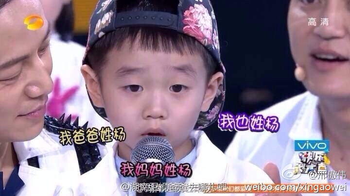 奥运冠军杨威带着儿子杨文昌上《快乐大本营》,小家伙因为在节目上的呆萌可爱表现而走红,当自我介绍的时候,他称“我爸爸姓杨,我妈妈姓杨,我也姓杨,所以我叫杨阳洋”,还称自己“我今年叫杨文昌,我属狼”。