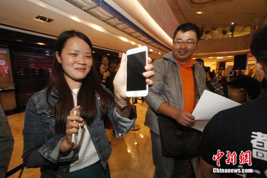 2014年10月17日零点,江苏省南京市,iphone6开卖。市民到场排队购买,现场买到手机的市民笑开颜。图片来源:CFP视觉中国