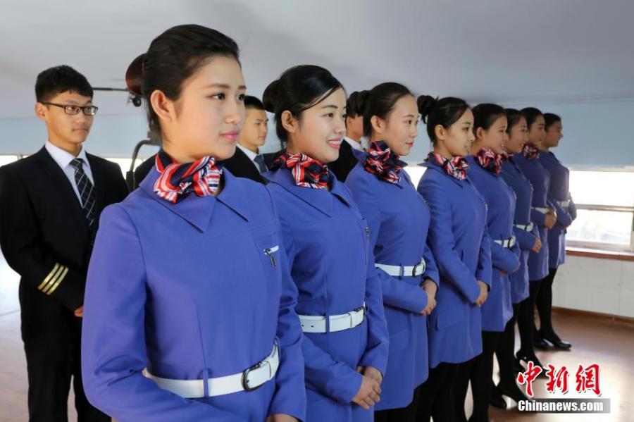 图为山东省潍坊市区一家模特专业考前集训班上,学子们正在进行空乘专业训练。