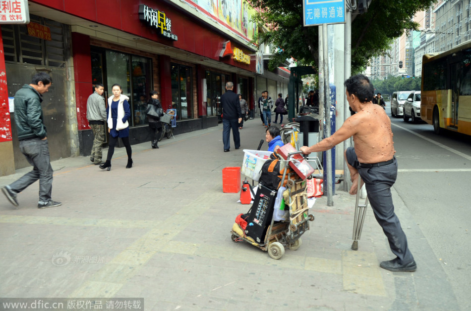 2015年1月9日下午,广州荔湾区中山八路,一名健全的男子在给一名身体残疾的乞讨女子喂水并取走女子乞讨来的爱心款。据附近商户介绍,这男女两人经常在这一带街头乞讨。摄影:金云国