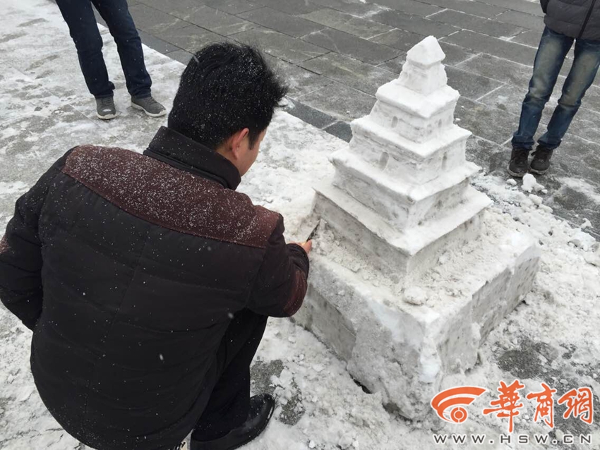 玩起来吧!工作人员大雁塔广场用雪造大雁塔 真像
