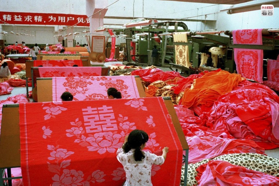 1986年1月27日,春节前夕,广东茂名化纤联合总厂赶制带有双喜字样的毛毯供应市场。这种毛毯是青年男女结婚时爱购买的床上用品。新华社记者李长永摄