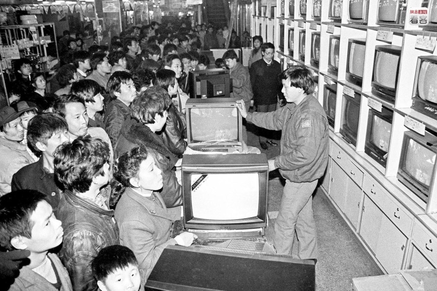 1988年2月初,随着春节的临近,湖北武汉中心百货大楼,前来选购电视机的人挤满了大厅,为的是买一台电视机回家看中央电视台的春节晚会。八十年代,冰箱、洗衣机、电视走进了人们的生活。武汉晚报 周国强 摄/CFP