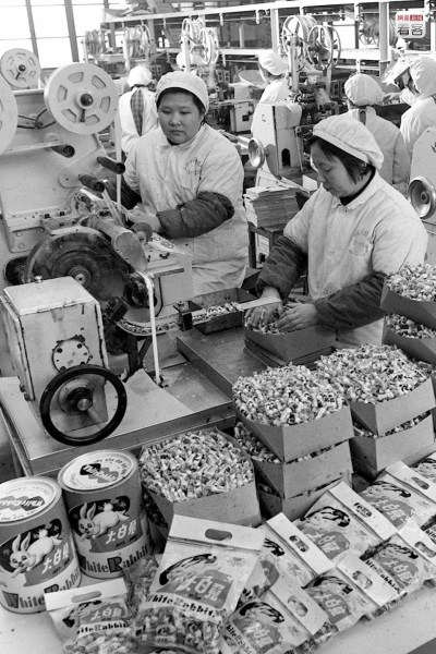 1977年2月9日,上海益民食品五厂糖果车间,工人在为春节生产一批“大白兔”奶糖。在新年期间,不少家庭的糖盒里都可以找到大白兔奶糖的踪影,“大白兔”奶糖是许多人的童年回忆。新华社记者徐义根、夏道陵摄