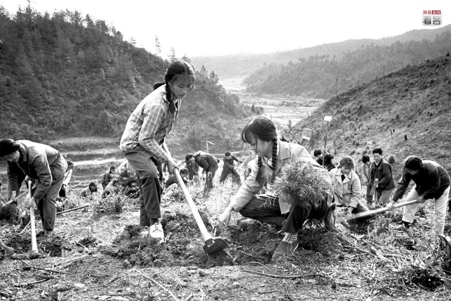 1981年1月29日,春节前夕,福建省邵武县城关公社王亭大队团支部为迎新春,组织50多名共青团员在荒山坡上种植了4万株杉树。新华社记者程曦摄