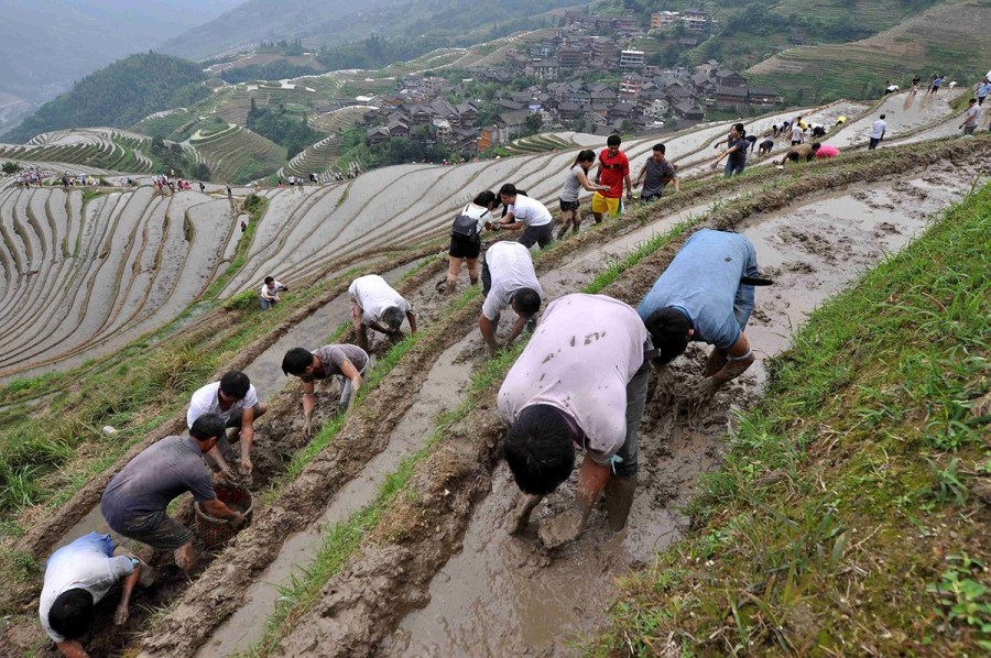 6月6日,广西壮族自治区桂林市,当日,在广西龙胜各族自治县龙脊镇平安壮寨一年一度的“梳秧节”上,附近村寨130名男女村民组成13个队,光着脚丫在梯田上展开欢乐十足的捉泥鳅比赛,浓浓的童趣吸引了众多游客的眼球。旭胡/CFP