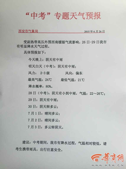 西安市气象局工作人员建议,中考期间,西安市有降水过程,气温相对较低,请考生携带雨具,出行注意安全。