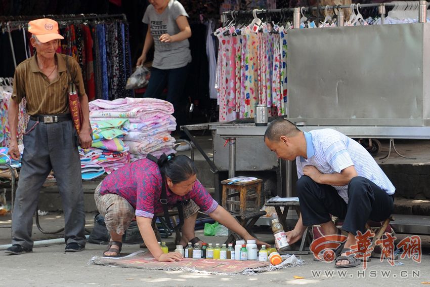 6月9日中午,记者来到董先生挖“鸡眼”的西安市长安区韦曲老街的摊上,给他挖“鸡眼”的妇女仍在摆摊。 华商报记者 赵彬 摄 张成龙 文