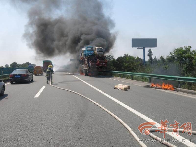 下午7时30分,华商报记者再次从福银高交大队获悉,失火豫D39167号大货车当时(原因待查)载有20辆三轮摩托,交警、路政、消防互相配合对着火车辆扑救,大火被及时扑灭,车上10辆三摩托过火,10辆完好无损,大货车受损严重。目前损失和起火原因正在统计和调查中。
