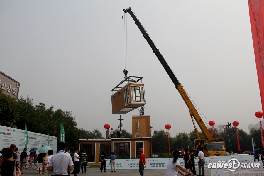 工人们陆续将这些建筑模块吊起来,拼接安装。不到3个小时,一栋2层别墅落成