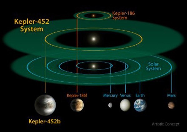 这颗行星距离地球1400光年,绕着一颗与太阳非常相似的恒星运行。那颗恒星的质量比太阳多4%,亮度则要多出10%。开普勒452b到那颗恒星的距离,跟地球到太阳的距离相同。图为开普勒望远镜之前发现的kepler-186星系与kepler-452b所在的星系,我们的太阳系比较。 Kepler-186系统的恒星因为比太阳小很多,所以它的主要行星几乎都很靠近恒星,大约和我们太阳系的水星轨道相当。