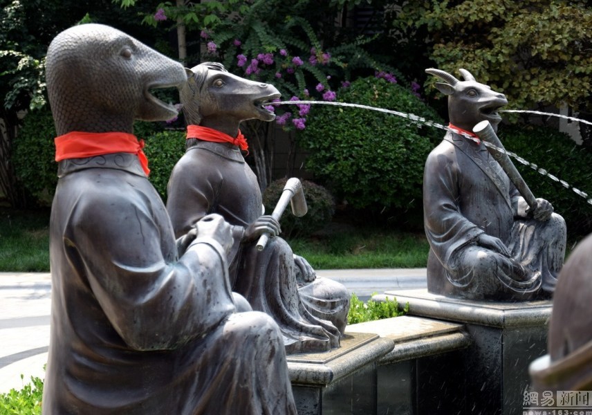 十二生肖兽首铜像呈“0”字形,分列在喷水池四周石台上,每个兽头和人身都是铜质,大小比例与圆明园海晏堂的十二生肖兽首铜像完全一致,整个造价约数十万元。