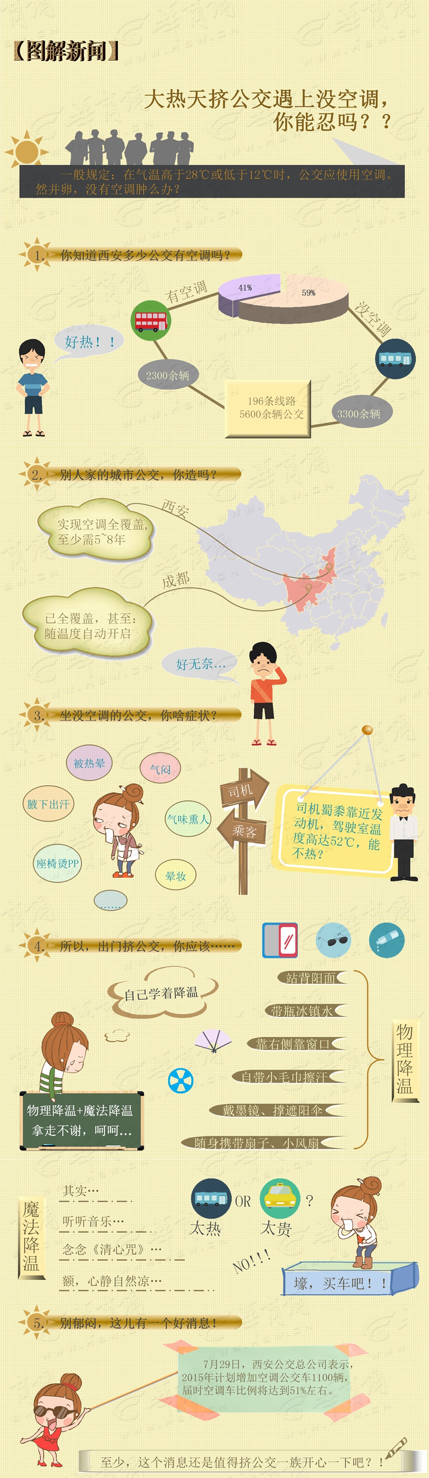 按照规定,在气温高于28℃或低于12℃时,公交应使用空调。然并卵,西安仍有很多没有空调的公交车,遇到酷暑当道该如何?