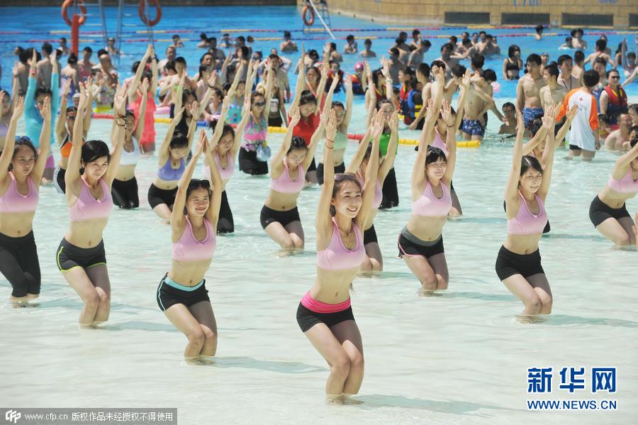 2015年7月31日,湖北武汉,武汉玛雅水公园里,来自一家瑜伽健身会所的百余名瑜伽爱好者在水上练起瑜伽。 图片来源:cfp