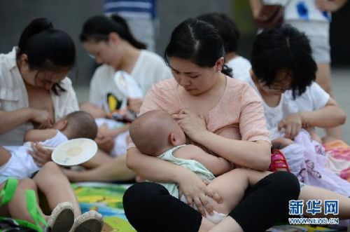 8月1日,西安妈妈们参加“哺乳快闪”活动。当日是世界母乳喂养宣传周的第一天,来自西安的30位妈妈带着宝宝在街头进行“哺乳快闪”活动。