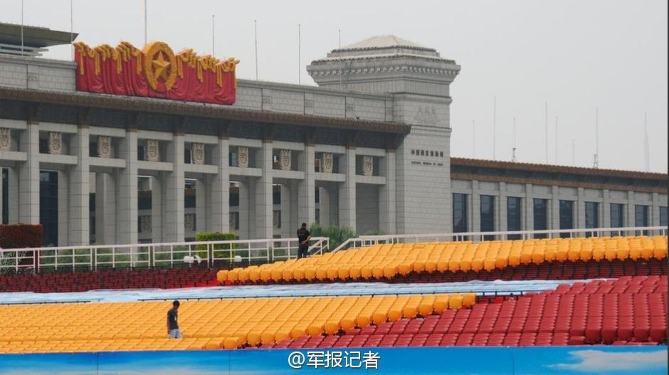 8月18日,北京,天安门广场国旗杆两侧的临时观礼台首次露出了真容,东西观礼台上的座椅被分成了不同的颜色。