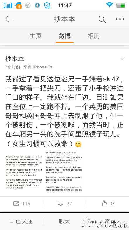 @法制晚报【法国火车遭枪击 女网友淡定直播】法国当地时间21日下午,一列从荷兰阿姆斯特丹开往法国巴黎的高速列车上发生枪击案,造成2人重伤、1人轻伤。女网友@抄本本 亲身经历了枪击案,并淡定的在微博上直播了全过程,经历这么恐怖的事居然还能调侃,佩服。