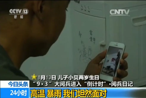8月13日,距阅兵还有21天。今天是我儿子小贝两岁的生日。趁休息时借记者的手机和老婆儿子视频通话了一下,好几个月不见了,怪想他们的。小贝一岁生日时我在野外驻训没能陪他,这次又因为阅兵任务不能在他身边,作为父亲还是感到有些愧疚的。不过等他长大了拿阅兵的视频给他看,他一定会为有这样一个老爹感到骄傲的。