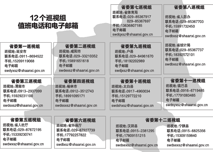 本报讯(记者赵明赵蕾)按照省委的统一安排,2015年省委第三轮巡视工作已全面启动,8月18日至21日,12个巡视组分别进驻延安市、咸阳市、渭南市、榆林市、省人社厅、省环保厅、省体育局、省统计局、省人防办、户县、太白县、镇巴县、汉阴县、宁陕县。