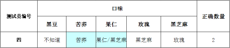 测试结果:答对苦荞一种,果仁勉强答。测试员“品尝的时候感觉黑芝麻、玫瑰甜味有点相似,品尝时觉得馅上面的口感差异不大,通过味道不好判断。”