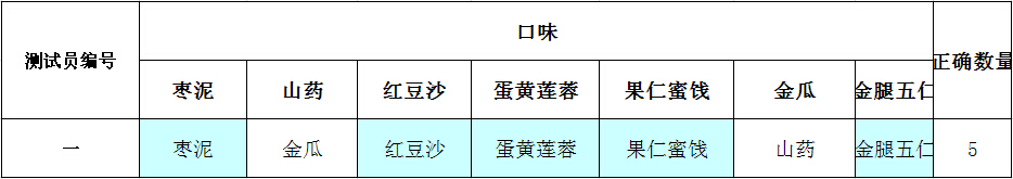 测试结果:答对五种口味。测试员“品尝的时候感觉金瓜和山药口感有点像,之前一直没有吃过五仁月饼,这次品尝后感觉还是接受不了五仁月饼,的确是月饼中的怪胎。”