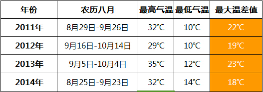 可以看到,每年的农历8月份大多在阳历的8月底或9月初来临,2013年的9月份,在短短十天内昼夜温差最大差23℃。而今年,截止到9月30日最低气温为12℃,最大温差值为16℃。进入秋季,天气逐渐转凉,一天之中“两头冷中间热”,甚至有时昼夜温差大于10℃,穿衣盖被不注意就很容易患上感冒。