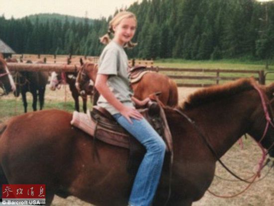 霍莉的母亲身高1.85米,父亲和妹妹的身高都是1.9米,她是家里最年轻也个头最高的。图为2008年霍莉在蒙大拿州骑马的照片。