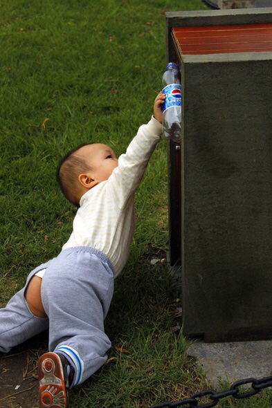 2010年9月25日,杭州西湖白堤草坪,为了将一个空饮料瓶准确地丢进垃圾桶,一位穿着开裆裤、迈着小短腿的小男生,一不小心被绊倒,圆滚滚的肚皮贴地,他还是努力伸长胖鼓鼓的小手臂,把瓶子丢进了目标垃圾桶……