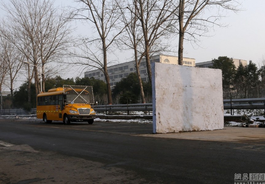 2015年11月27日,河南郑州,某工业园区举行校车安全质量检测,一司机驾驶校车在高速行驶状态下猛力撞上一面墙,顿时砖块横飞,一地狼藉,让百余围观者惊叹不已。