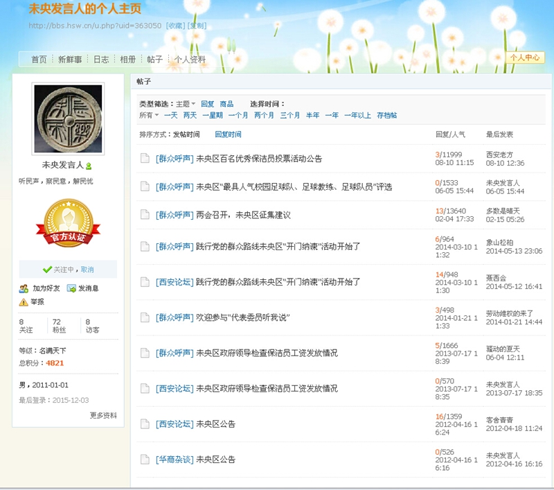 2009年,时任西安市市长的陈宝根提出“问计于民”的口号,未央区政府为响应市政府号召,开展了一些列的问计活动,其中一项就是在华商论坛注册“未央发言人”的官方账户。