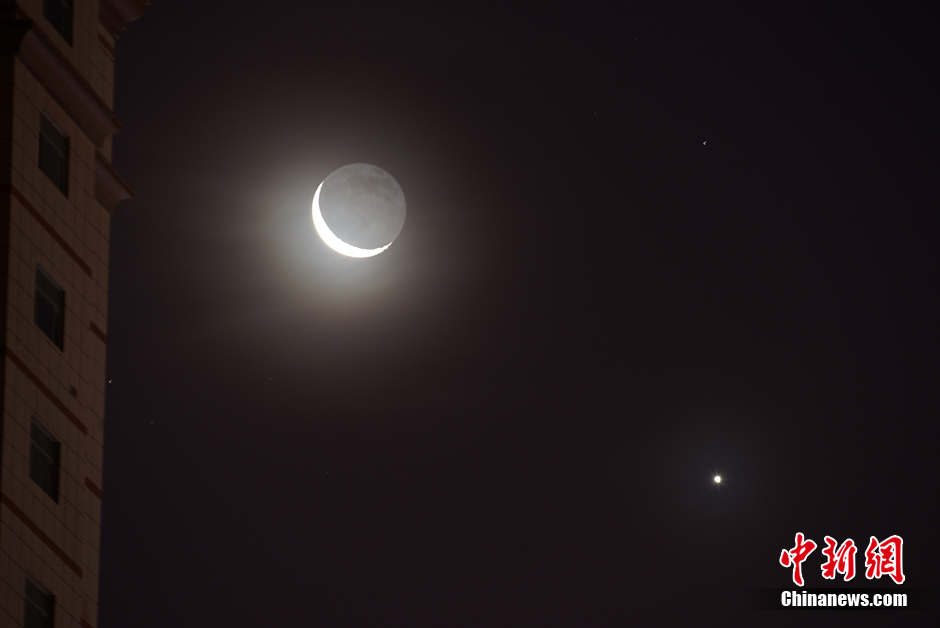1月7日清晨,在新疆库尔勒天空出现“金星合月”现象 。众多市民欣赏到了“维纳斯”与“月姑娘”约会的美妙情景。由于金星皎洁、明亮,所以在西方,把金星称作美神“维纳斯”。 中新社记者 确·胡热 摄
