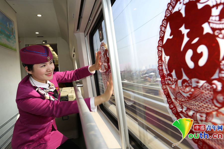 中国青年网北京2月4日电(记者 张炎良 通讯员 包亮)新春佳节临近,为使旅客春运回家之路更加温馨愉悦,成都铁路局重庆客运段动车乘务员们在车厢内挂上灯笼、贴上窗花,将狭小车厢布置得年味十足,让年味温暖每一位旅客归心似箭的旅客。