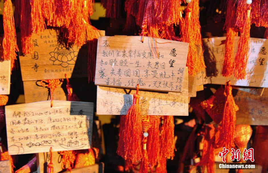 2月7日,除夕夜,四川峨眉山报国寺,来自各地的上万香客络绎不绝地赶到寺内烧香、撞钟和祈福,迎接猴年的到来,并祈求新年一切顺利。图为报国寺祈愿墙上,民众留下的新年愿望。刘忠俊 摄