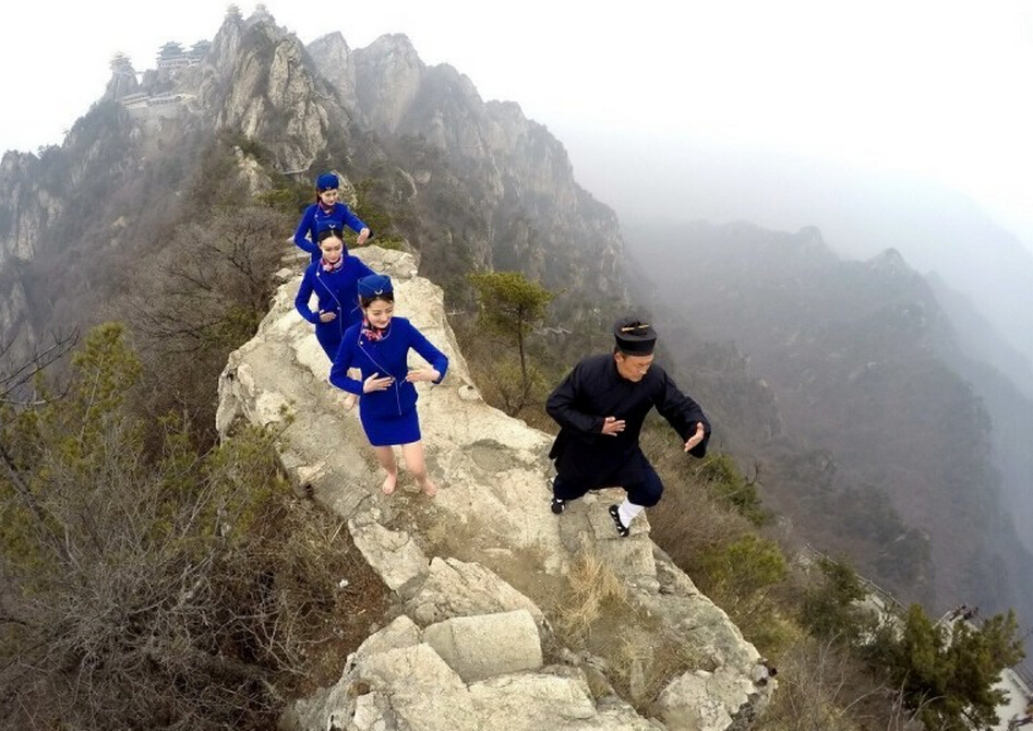 2016年3月7日,河南洛阳道教圣地老君山,三名准备应聘“空姐”的女子在海拔2000余米的老君山悬崖绝壁上跟随道士赤脚学武术练胆量。