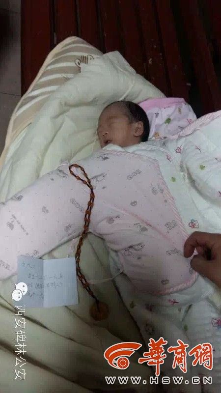 公安碑林分局长安路派出所民警魏正和周力接到群众报警后赶到现场,魏正打开孩子的襁褓后,发现里边是一名女婴,她的怀里放着一张纸条,上面写着:“久久,出生于2016年3月10日(农历二月初二)晚11点。”女婴的脖子上戴着一串玛瑙项链,前端戴着一颗纽扣大小的同材质吊坠。两位民警在周围询问一圈,发现没人认领这名,便带着孩子回到派出所。